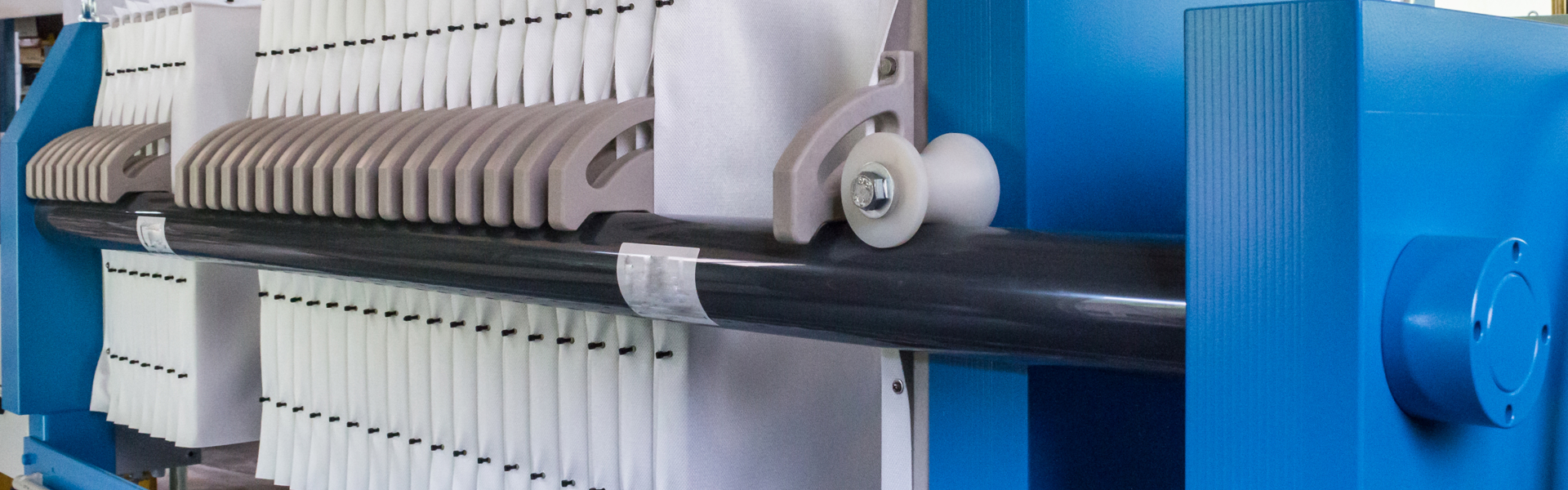 The Filter press consists of a head and follower that contain in between a pack of vertical rectangular plates. Each plate is dressed with filter cloth on both sides and, once pressed together, they form a series of chambers that depend on the number of plates. The entire pack of plates is supported by side or overhead beams.