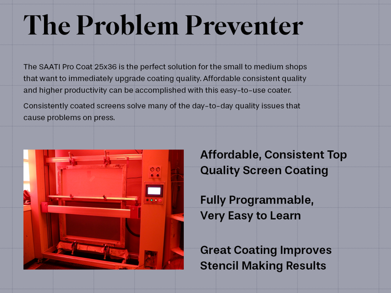 The SAATI Pro Coat Series provides perfect solutions for the small to medium shops that think automatic coating is too expensive to justify.
