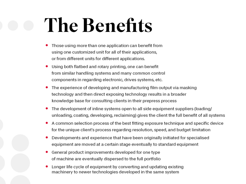 The innovative imaging technology using DMD chips enables high resolutions, fast imaging times and lower production costs. The product portfolio is constantly being expanded and adapted to customer requirements.