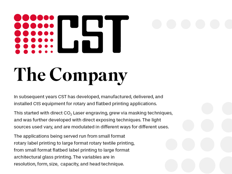 Get familiar with the history and philosophy of CST, the world class provider of combined imaging & exposure machines for screen printing